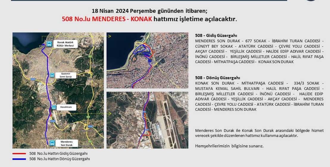 İzmir Büyükşehir Belediye Başkanı Dr. Cemil Tugay, seçimden önce yurttaşlardan gelen yoğun talep üzerine 121 ve 508 numaralı ESHOT hatlarını yeniden devreye alma sözünü tuttu. Mavişehir Aktarma Merkezi-Konak ve Menderes - Konak otobüs hatları, 18 Nisan Perşembe gününden itibaren hizmete açılacak.