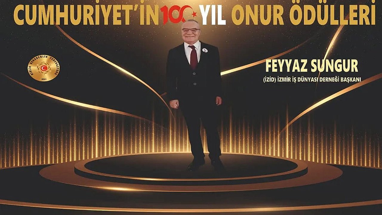 İZİD-İzmir İş Dünyası Derneği Başkanı Feyyaz Sungur’a Cumhuriyet’in 100.’ncü yıldönümünde anlamlı ödül. İzmir iş dünyasının önde gelen sivil toplum kuruluşlarından İZİD, Birlik ve Beraberlik Federasyonu’nun Ahmet Adnan Saygun Sanat Merkezin’de düzenlediği ve Cumhuriyetimizin 100. Yılında gerçekleşen ödül gecesinde onur ödülüne layık görüldü.