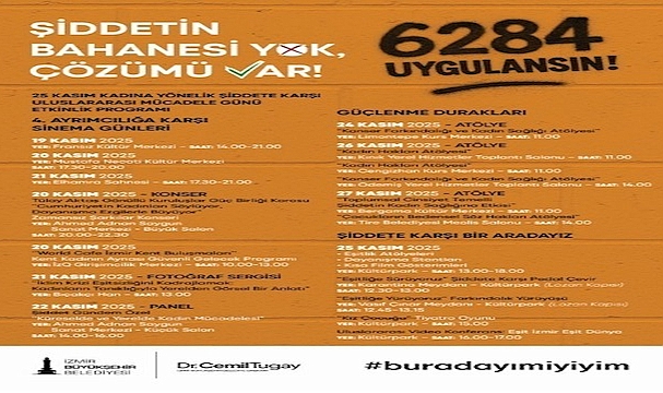 İzmir Büyükşehir Belediyesi, 25 Kasım Kadına Yönelik Şiddete Karşı Uluslararası Mücadele Günü kapsamında, kent genelinde “Şiddete Karşı Bir Aradayız” ve “Birlikte Güçleniyoruz: Şiddetsiz Bir Kent İçin Kadın Dayanışması” temalarıyla, kadına yönelik şiddete karşı dayanışmacı ve katılımcı etkinliklerin yer aldığı bir farkındalık programı hazırladı.