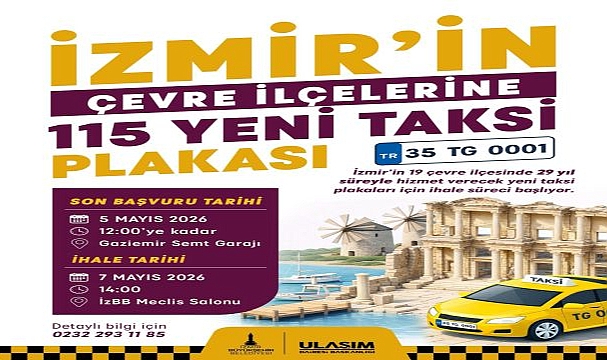 İzmir Büyükşehir Belediyesi, Aliağa, Bayındır, Bergama, Beydağ, Çeşme, Dikili, Foça, Karaburun, Kemalpaşa, Kınık, Kiraz, Menderes, Menemen, Ödemiş, Seferihisar, Selçuk, Tire, Torbalı, Urla olmak üzere 19 çevre ilçede 29 yıl süreyle hizmet verecek yeni taksi plakaları için ihale sürecini başlattı. İzmir Büyükşehir Belediye Meclisi tarafından geçtiğimiz ay onaylanan çalışma kapsamında ihale, 7 Mayıs 2026 Perşembe günü saat 14.00’te belediye Meclis Salonu’nda gerçekleştirilecek.Başvurular 5 Mayıs’a kadarİhaleye katılmak isteyenler, 5 Mayıs 2026 Salı günü saat 12.00’ye kadar başvurularını Gaziemir Semt Garajı’nda bulunan Toplu Ulaşım Hizmetleri Şube Müdürlüğü Ruhsat Birimi’ne yapabilecek. Şartname bedeli 1000 TL olarak belirlendi. Detaylı bilgiye 0 (232) 293 11 85 numaralı telefondan ulaşılabilecek.Merkez ihalesi 30 Nisan’daİzmir Büyükşehir Belediyesi’nin; Balçova, Bayraklı, Bornova, Buca, Çiğli, Gaziemir, Güzelbahçe, Karabağlar, Karşıyaka, Konak ve Narlıdere olmak üzere kent merkezindeki 11 ilçede 29 yıl süreyle hizmet verecek 100 taksi plakası için yapacağı ihale ise 30 Nisan 2026 Perşembe günü saat 14.00’te belediye Meclis Salonu’nda gerçekleştirilecek. Başvurular 28 Nisan 2026 Salı günü saat 12.00’ye kadar alınacak.